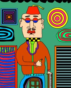 Visual artist, James Frye, hand sketches wildly, vibrant, electronic documents in an abstract style that are transferred to canvas for hanging. James is a Synesthetes, he has the ability to hear colors.