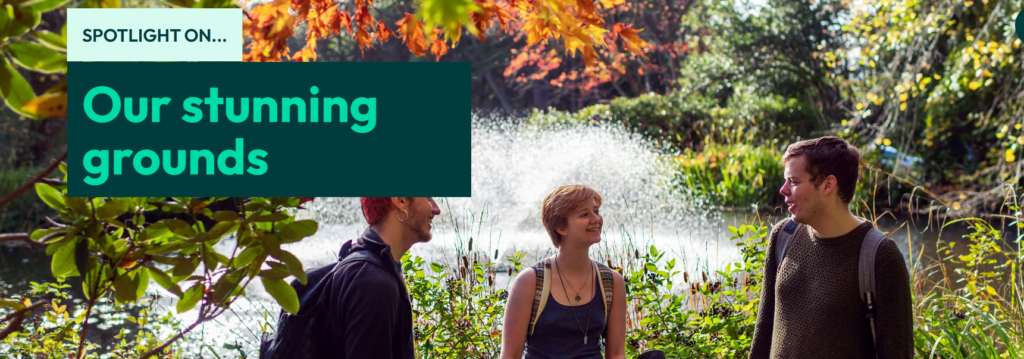 Across more than 150 hectares of University land, our grounds include gardens, wildflower meadows, ponds and watercourses, woodland and historic landscapes — all maintained carefully to support biodiversity while enhancing the campus experience.
