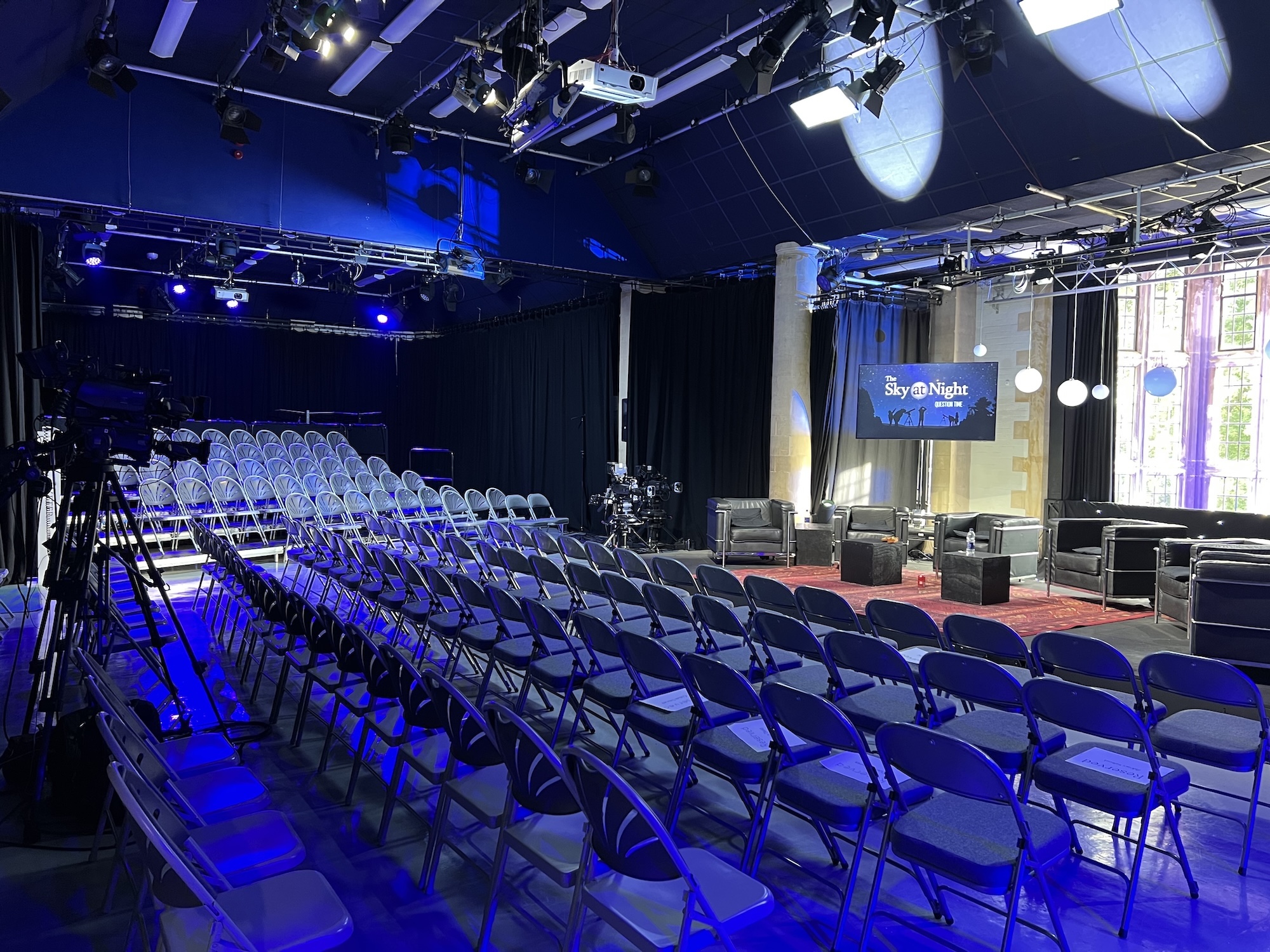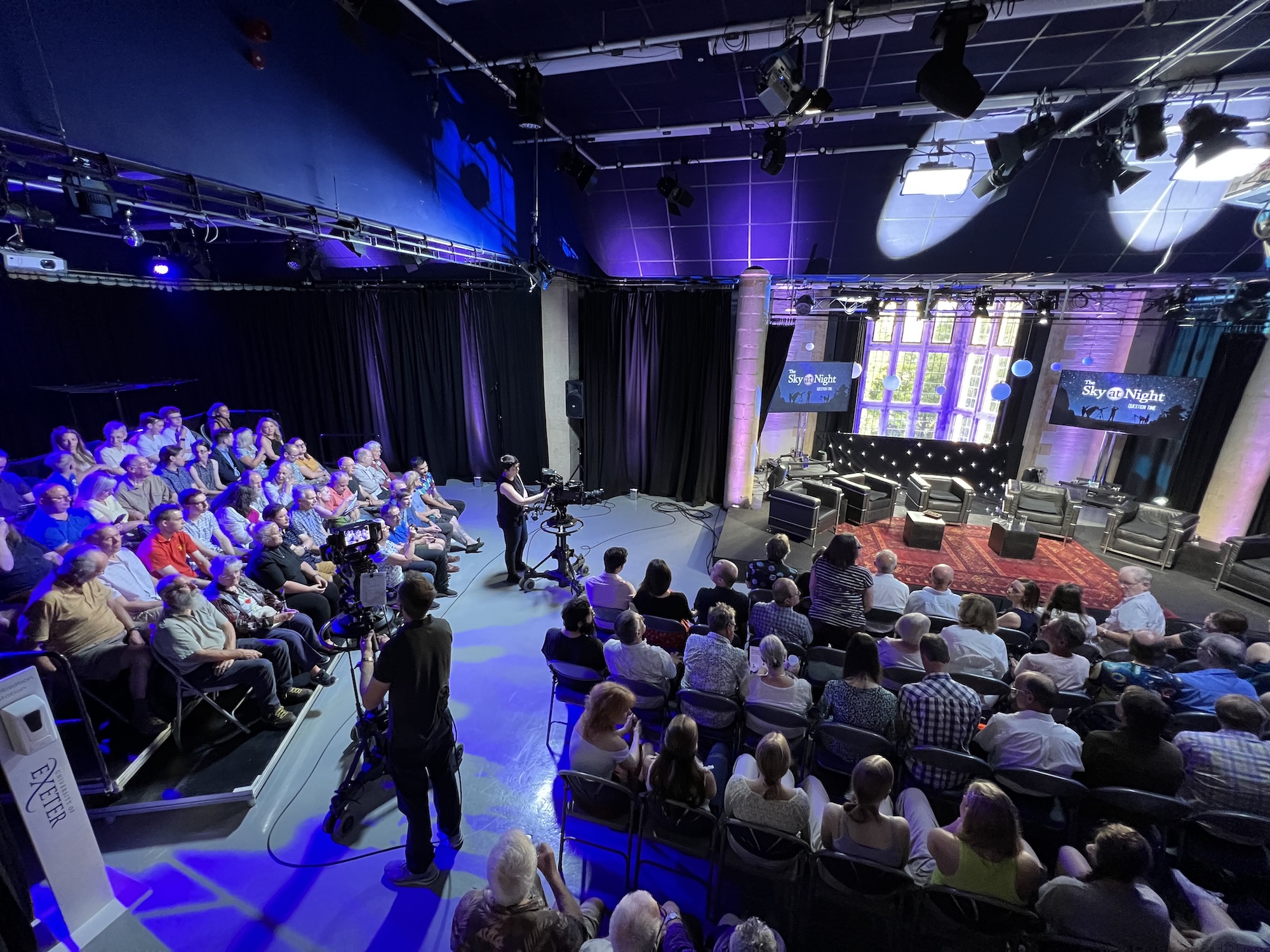 8 September 2023The CDF tech team have worked with BBC production staff as part of the British Science Festival, to transform Roborough Studios into a TV Studio for the Question Time Special of BBC’s iconic Sky At Night programme. The studio was filled with a lively audience, and a panel of Sky at Night regulars was joined with special guests from Exeter. Our LED lighting rig was used to light the audience and TV lighting was brought in to light the panel. We also provided the AV equipment, staging, props and furniture for the event. The setup was also used for a talk by staff from the BBC Natural History unit the next day.