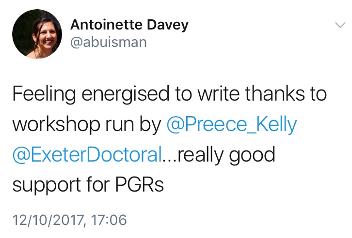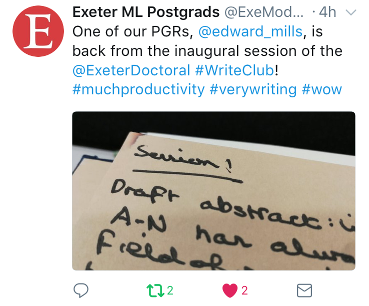 Do you want to start-up your own writing group, or facilitate one of our Write Clubs? We already have a Shut Up and Write Tuesday group that meeting every Tuesday in the Old Library Computer Cluster! We are happy to provide support and training to anyone interested, so please get in touch with my on k.preece@exeter.ac.uk!