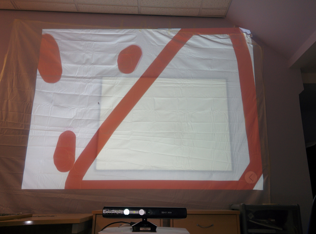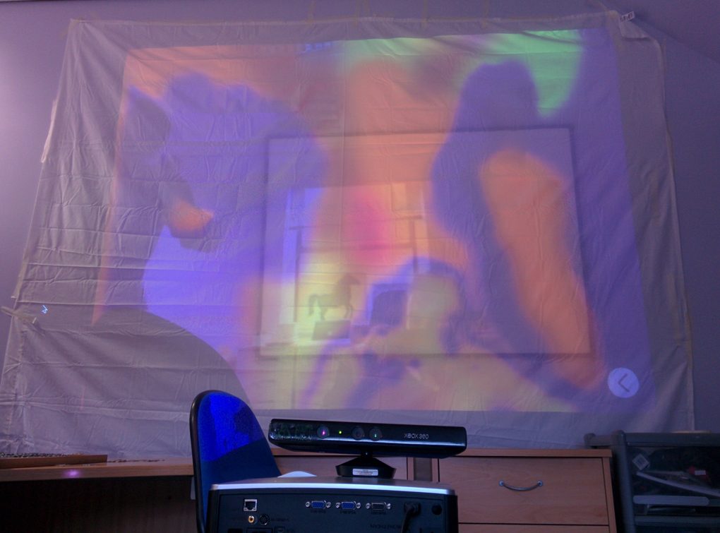 For a bigger more dynamic experience we used another Cardiff School of Art and Design and Cariad Interactive program, Somantics, and a projector, screen and Xbox 360 Kinect camera to capture physical movement. The set up was a real attraction, causing traffic jams as centre users passed by.