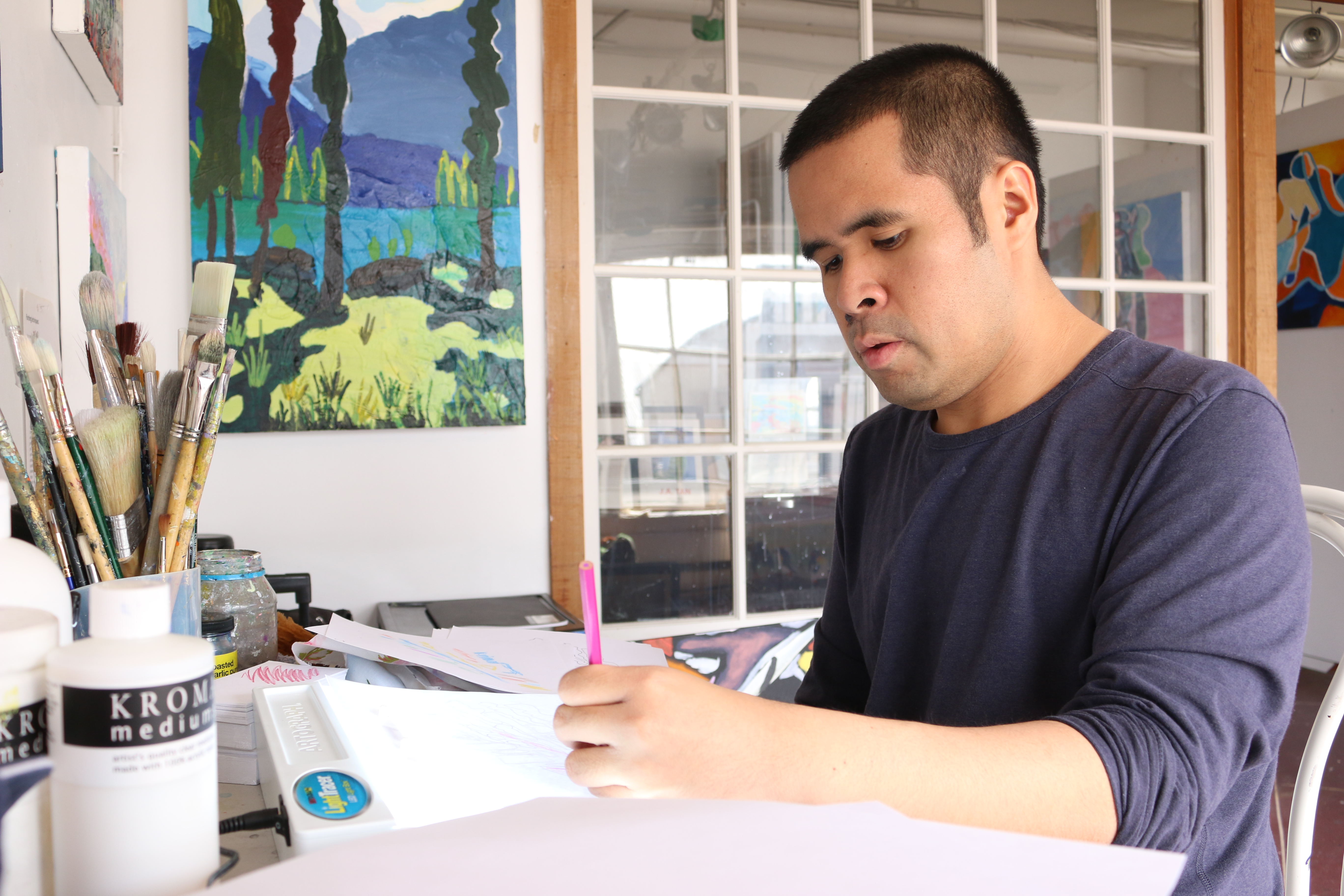 We looked through JA’s sketch book and he picked a drawing he would like to animate. A penguin on a rocky beach. He looked at a video on his camera as reference and animated the penguin flap and look up. Once he was happy with the penguin animation he drew a rocky background and traced it on to each frame. He then coloured each picture and after that photographed them with the animation app. we worked without a break for about 3 and a half hours. Jeanne told me the next day that usually they’ll do about 2 hours with a half hour break in the middle so this is a pretty prolonged and intense period of concentration. JA got a headache and we called it a day and went for lunch. on the way he introduced me to the person who makes paint in the paint shop. They make incredible acrylics.