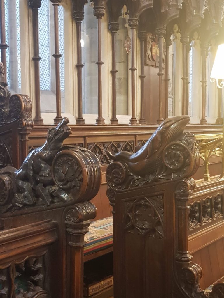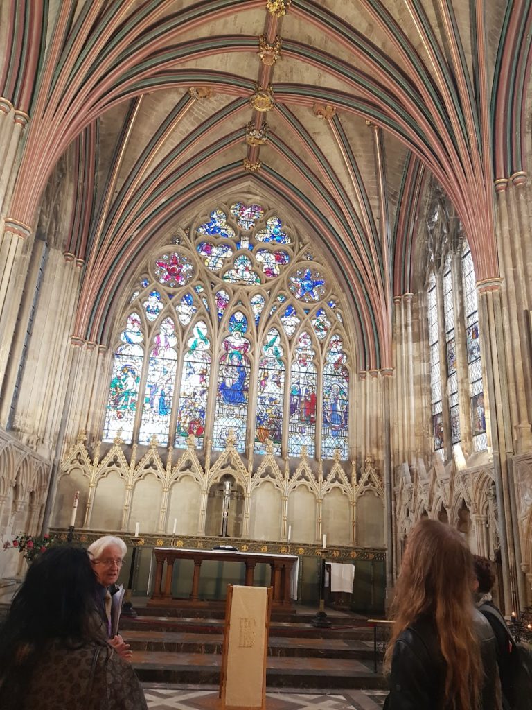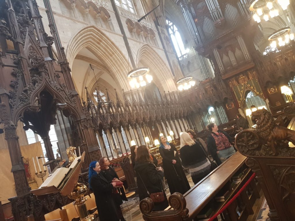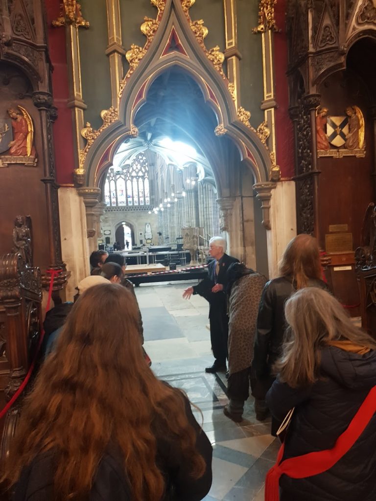 The tour was thorough and well-read, with many opportunities to find elements of magical interest for the students. Among the many highlights was the much-loved Green Man peering down from the ceiling, sparking lively discussion about foliate imagery and its enduring magical resonances, even within a traditionally Christian space. We also lingered over the many beautifully carved animals tucked around various chantries, noticing how these figures quietly populate the sacred space with layers of meaning, myth and marginalia built into their iconography. As we moved through the cathedral, our guides shared a selection of haunted tales and uncanny anecdotes, which felt especially potent while walking through such a notorious and storied building.