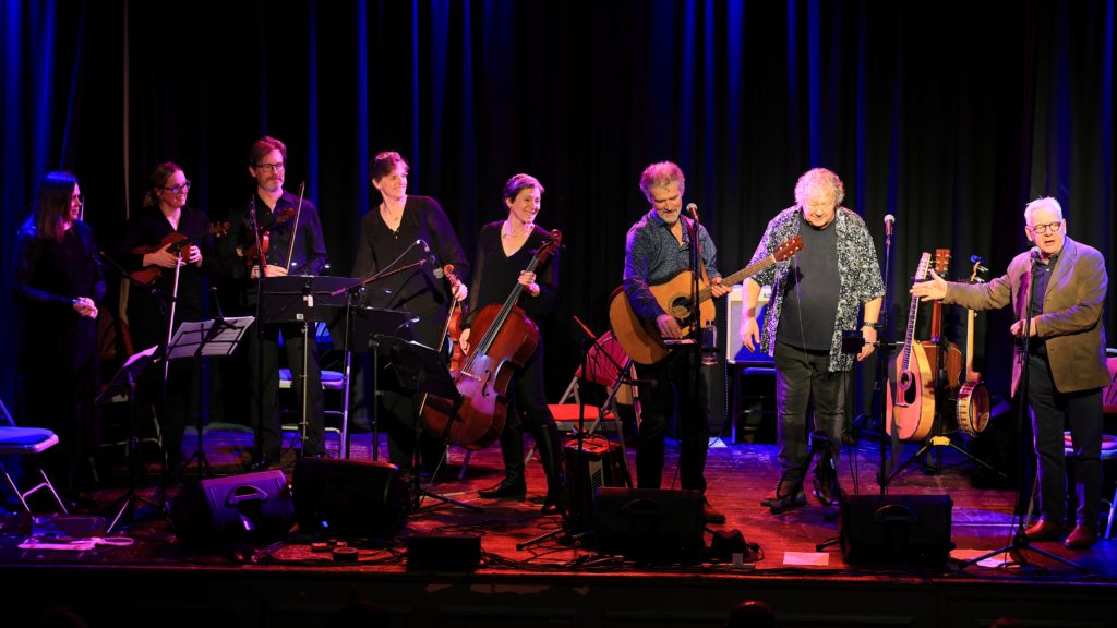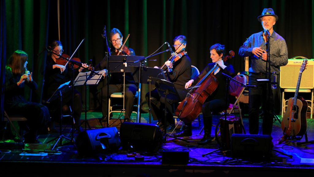 Put the pigeonholes in your pockets – there’s nothing quite like this new show. Chris Hoban is well known to Topsham as a superb singer and songwriter, appearing often with Show of Hands, writing brilliantly about Devon and the Exe. This, though, is different. Imagine an evening of songs written around people’s wills, from the sixteenth to the early nineteenth centuries, recovered from the archives. Could be a bit dry, even from a master songwriter? Really not, when you’ve a string quartet (with some depping on woodwind), brilliant electric guitar, a hurdy gurdy, and the driving rhythm of Paul Downes on banjo, mandocello, guitar – and when the songwriter is also a brilliant composer and arranger in modes across folk, jazz, blues, rock, and the classical canon.