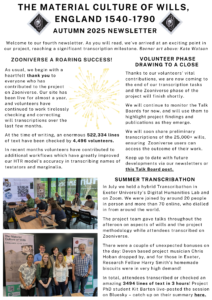 It’s been 4 months since the launch of the ‘Material Culture of Wills’ Zooniverse site, and we’d like to say a huge THANK YOU to every single person who has got involved. We’ve been overwhelmed by the level of engagement – at the time of writing 2,582 volunteers have contributed, transcribing over 350,000 lines of text from early modern wills, and putting in more than 7,800 hours of work.
