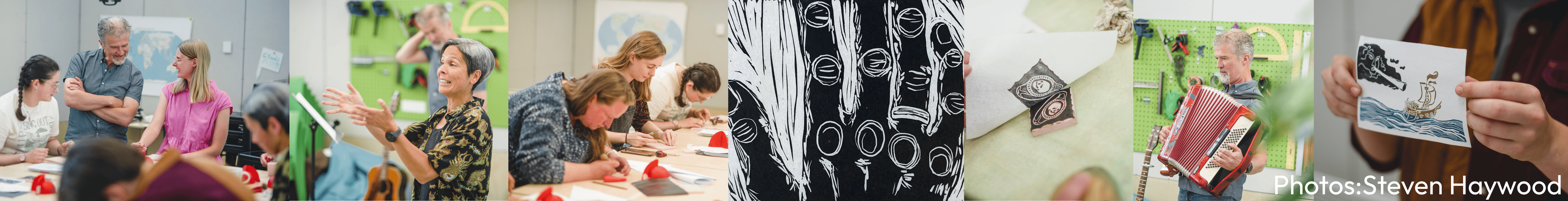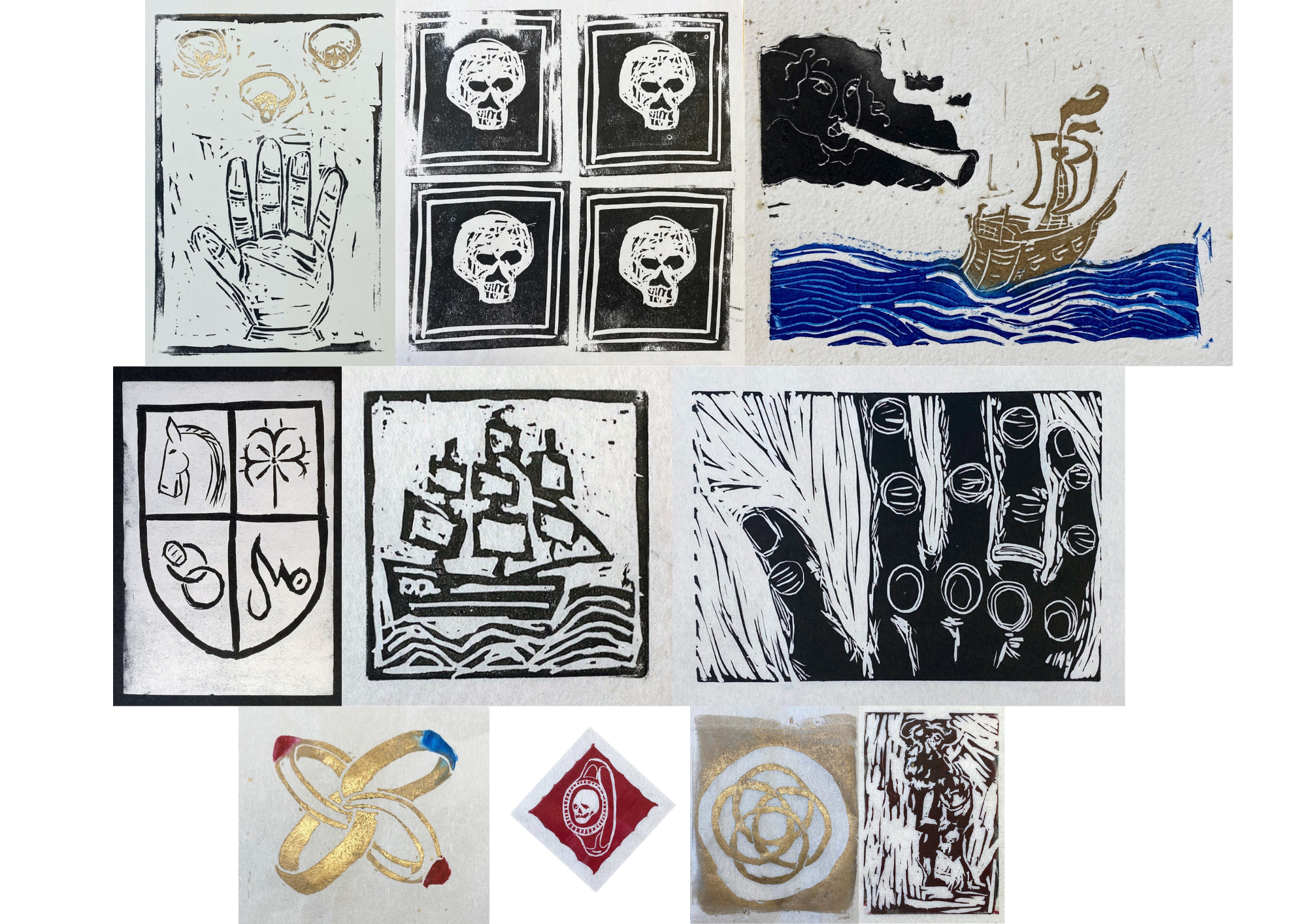 Prints created by (from top left-right): Esme Thompsett (hand with 3 rings above); Emily Vine (4 grinning skulls); Kit Barton (ship in colour); Laura Sangha (shield); Jane Tozer (black and white ship); Fiona Rourke (hand); Kit Barton (4 rings); Kate Watson (red ring); Sarah-Jayne Ainsworth (gold rings motif); Jane Witkin (trumpet player).