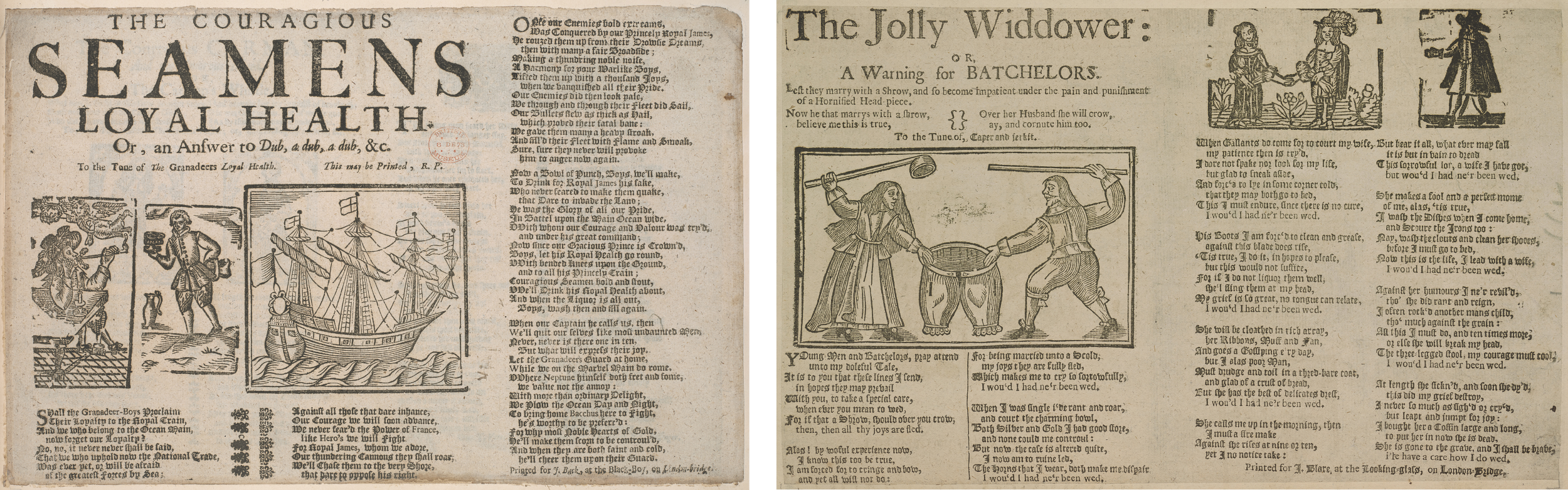 In the course of their conversations, Chris and Laura often returned to early modern ballads, the most popular form of music in early modern England. Ballads were hugely popular – the pop songs of the day – and they have therefore become a vital source of evidence for historians, particularly those interested in England’s cultural landscape and people’s everyday lives. These ballads linked the oral culture of the majority with the literate world of the written word, since the lyrics were not only sung, but were also printed and sold as ‘balladsheets’. These were very cheap, one-page publications, which were very often illustrated with a woodcut image. Below are two original balladsheets – these are from the English Broadside Ballad Archive, where you can view hundreds more examples, and even listen to recordings!