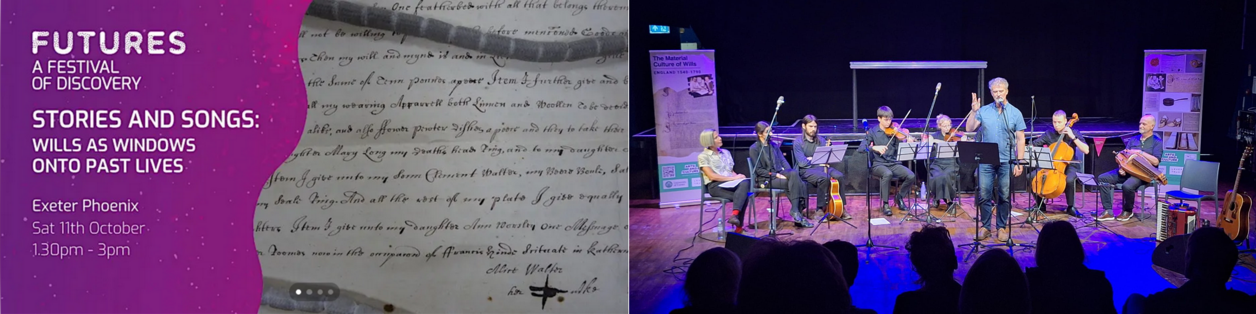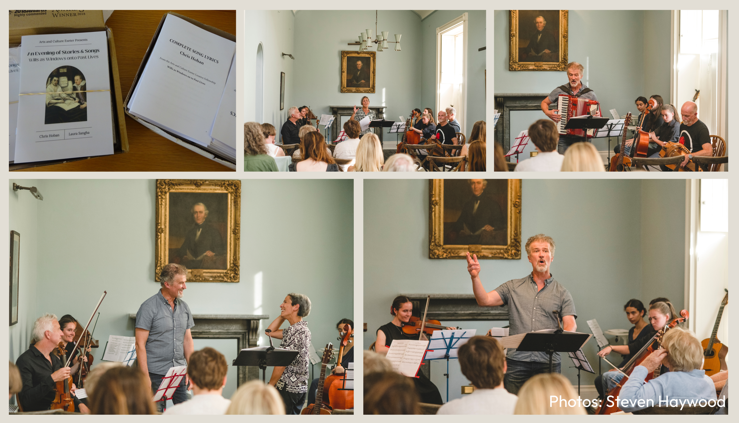 Chris and Laura performed their ‘Stories and Songs’ on stage in the Phoenix Arts Centre in Exeter city centre. Chris once again managed to put together a stellar ensemble of musicians to bring his compositions to life, and there was a really excellent turnout – more than a hundred people came to the Auditorium to learn more about the wills and see and hear Chris’ songs performed.