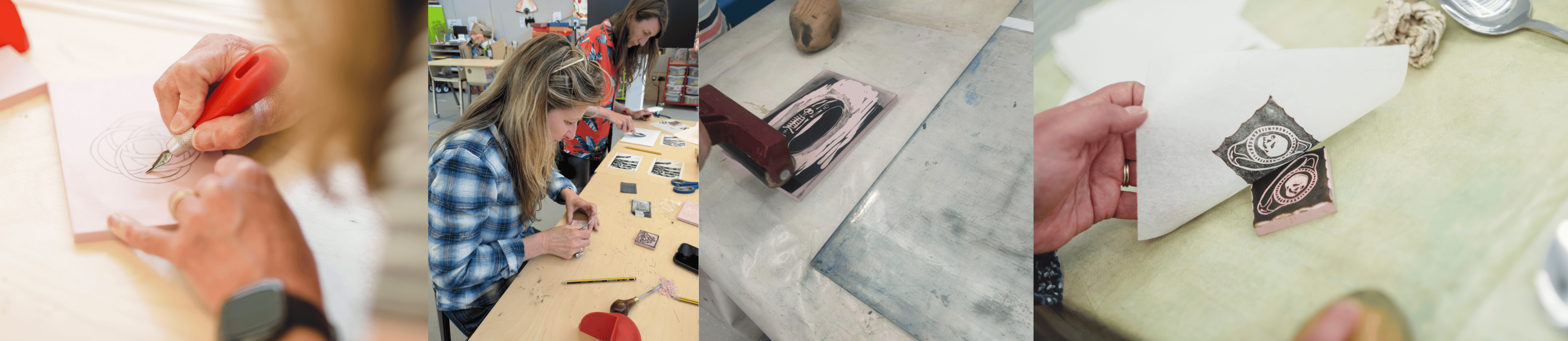 Chris and Laura were reflecting on the ballads’ combination of text, tune and image and started to wonder what adding a visual element to their own collaboration would bring – what if people were given some of Chris’ lyrics sparked by the wills and were asked in turn to draw on their creativity to illustrate them? The Arts and Culture team put the duo in contact with Emma Maloney of Exeter’s Double Elephant Print Workshop and she expertly assisted them to organise a print workshop at the University of Exeter on a sunny day in May 2025 where attendees did just that. Participants were given wills and lyrics to read in advance, and were asked to create a linocut (much quicker and easier to work with than wood) that would illustrate one of Chris’ songs.