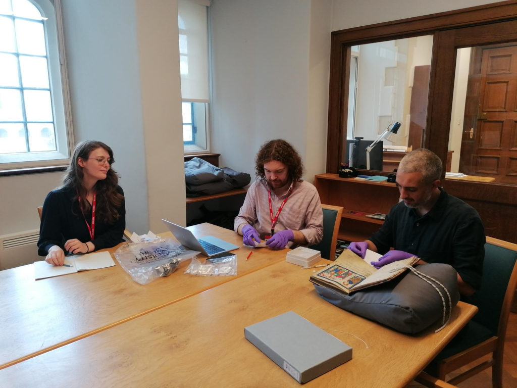 We were there to carry out a ‘biocodicological’ study of the manuscript, with the aim of  identifying the species of animal skins used in its production, and investigating the individuals who may have used it in their education. The initial process involves gently rubbing a plastic eraser across the surface of the parchment to collect microscopic collagen fibres that adhere to the eraser crumbs. This sampling was undertaken by a member of the College’s conservation team to ensure that the manuscript remained entirely unharmed.