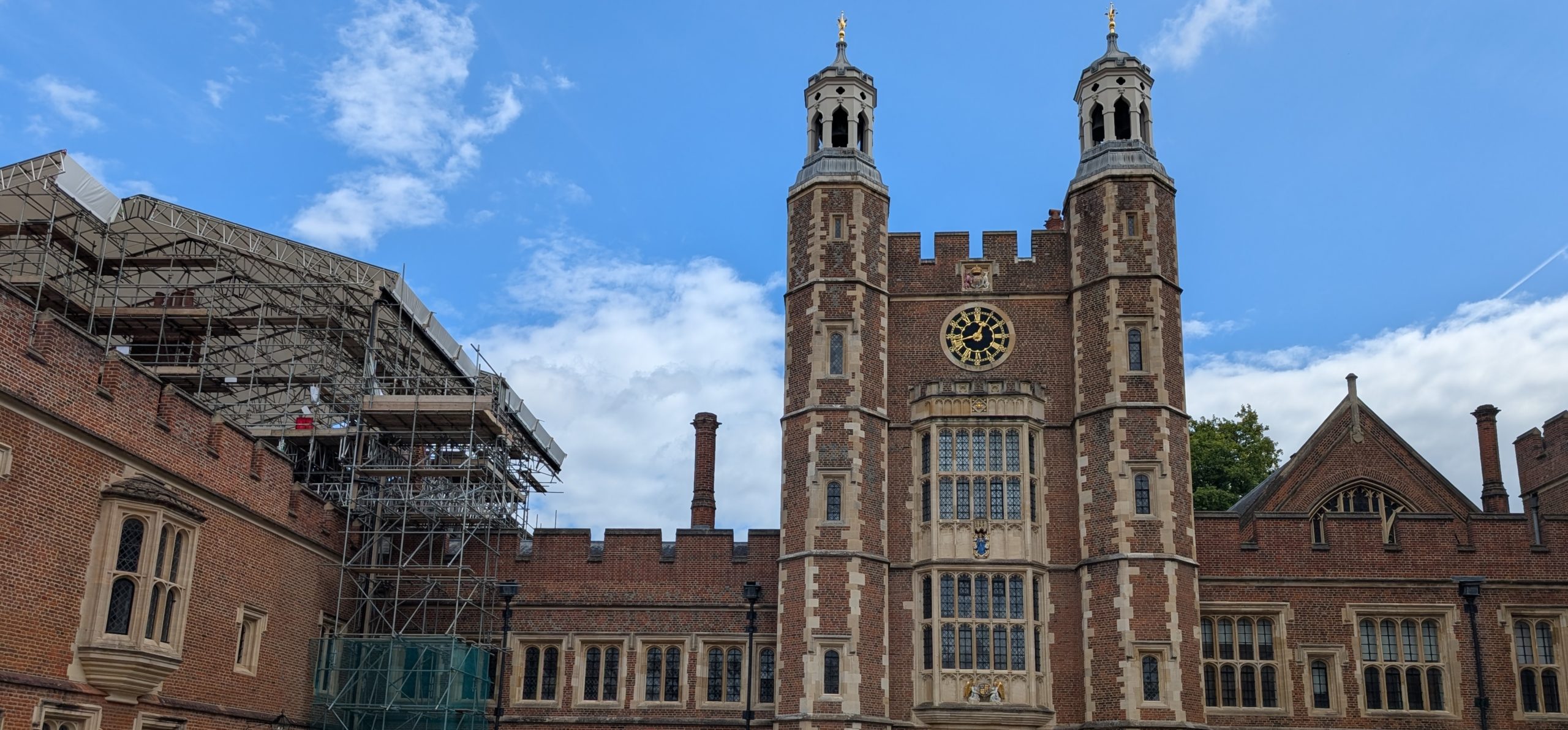 In late July 2025, Clementine Pursey and I made the journey to Eton to examine a manuscript for our research on the Learning Anglo-French project. Much like arriving at an Oxbridge college, we entered through the gatehouse and reported to the porter’s lodge, from where we were collected by the librarian and led towards the library that sits at the heart of the school. As we passed through the cloisters and corridors, it was reassuring to see that not even Eton has escaped the schoolboy’s instinct for graffiti —though the names were carved with a serifed elegance in keeping with the surroundings.