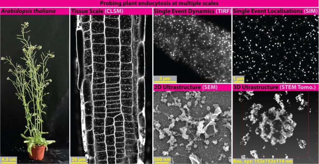 Alex Johnson researches the fundamental eukaryotic cell biology processes regulating cellular sensitivity to environmental stimuli, specifically endocytic mechanisms and their roles in receptor internalisation in plants. Plants provide our staple food, nutrition, and oxygen, so understanding how they mediate sensitivity to the environment is essential for maintaining human wellbeing. As sessile organisms, they are exposed to changing conditions and must modulate their sensitivity in response. Endocytosis pathways, such as Clathrin-mediated endocytosis CME), are central to this process. Despite CME’s physiological significance, it remains poorly understood in plants. However, recent work has found that it is evolutionarily and mechanistically distinct from other model systems, highlighting critical gaps in our understanding of eukaryotic CME. Using a range of quantitative microscopy approaches, we examine plant endocytosis at tissue (confocal), live single-event (TIRF and super-resolution SIM), and ultrastructural (SEM and STEM tomography) scales. By combining these tools with biochemistry (interactomes, proteomes, in vitro reconstitution assays) and biophysical imaging (Brillouin light scattering), we are investigating: 1 – How single events of CME work? 2 – How CME mediates specific environmental responses? 3 – How plant endocytosis compares to other eukaryotic models? Together, these will provide a new understanding of how plants sense and adapt to their environment, at the molecular level and beyond.