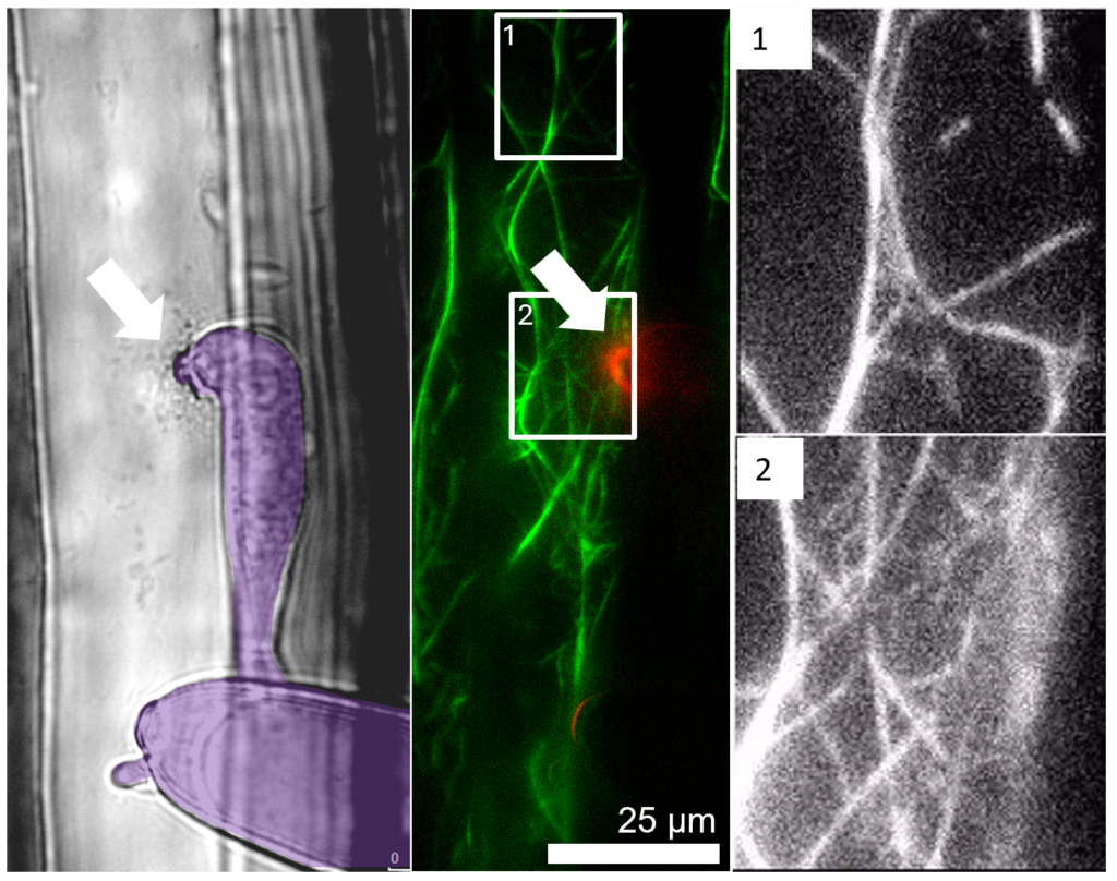 We are interested in the way plant cells respond to spatial information to guide immune responses. The cells of plants have an acute awareness of the events occurring immediately beyond their walls and make spatially precise responses to any perceived threat. Potentially pathogenic microbes trigger plant defences to focus within a few square microns of the plant cell surface. This process can be summarised as ‘pathogen-oriented cell polarisation’. The response is effective against most microbes but successful pathogens evade these counter-measures and establish infection. Our team aims to understand how multiple cell processes (the cytoskeleton, trafficking and receptor signalling) are co-ordinated as a system to achieve this important response that underpins the plant immune system. For instance we have discovered that cargo delivery and actin networks are closely coupled through FORMIN proteins during this process. This research is an interdisciplinary challenge involving multiple collaborators in different fields.