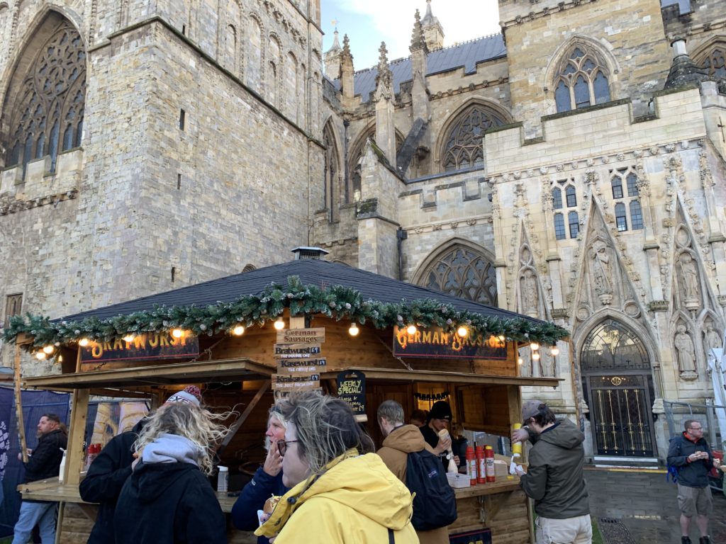 But what’s even better than Exeter high street, lit up by fairy lights? Exeter Christmas market! It’s no joke, Exeter takes its Christmas market seriously. At first sight, it’s certainly mystifying enough to stop you in your tracks. With over 100 wooden stalls sprawled out in all directions, decorated with baubles, holly and lights, against the glorious backdrop of the historic Exeter Cathedral, it’s gothic architecture aglow in the moonlit December evening, this is something essential for all students to see. So essential in fact that I had to visit it multiple times, taking multiple different routes, at multiple times of day, just to ensure I fully appreciated the scene. It’s so close to campus, there’s really no excuse for not sneaking away to experience it for yourself. From hot food and Christmas bakes to jewellery and trinkets, and so, so very much more, this is the perfect place for Christmas shopping or spending time with friends. Visiting this market, it’s impossible not to feel the Christmas spirit, people bustling all around you, Christmas music playing, stall owners talking animatedly about their handmade goods. And if you’re really lucky and listen closely, under layers of chatter, laughter, music… you might just hear the carols of the Cathedral choir.