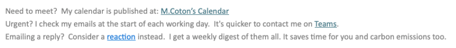 On reflection, I think I’m pretty pleased with that. I’m not an emailer by choice – preferring the features of Teams chat where I can avoid Reply All and yet still communicate with a team of people. I’m setting myself the target of actively courting Teams instead of email, and reactions instead of replies.